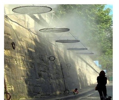 由于水雾的蒸发面积很大,空气中悬浮的尘埃会被漂浮的水雾俘获,并降落到地面,从而达到除尘、净化空气的目的.当接触到干热的空气,瞬间即会被蒸发,并在此过程中将大量热量带走,在炎热季节具有很好的降温效果.