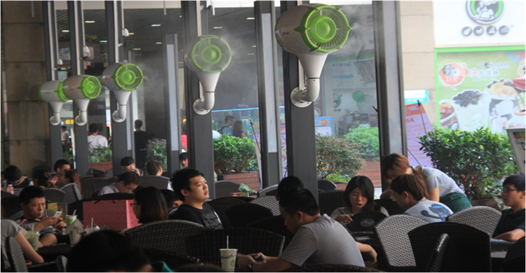 气雾双流,柔和的风与10-30微米的雾粒相结合,可降低温度达3-5℃,提高空气相对湿度,减少粉尘,从而有效提高人体舒适度。