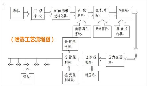 喷雾系统是用水造雾的高科技机电一体化设备;系统机组将原水净化加压至4.5MPa以上,通过高压管道将高压水通过喷头微孔喷出,使水雾化成小颗粒,小颗粒在气动作用下进一步二次雾化成无数微米级的水雾,连续重复多重效果,形成连绵雾海状,通过程序、时间、雾效重数控制雾海的浓度,达到观赏目的。------这就是景观造雾的工作原理