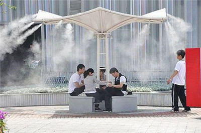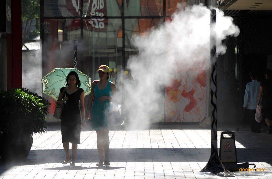 在夏天,当城市气温到达35度以上时,即使打着伞,戴着太阳镜,来自太阳的直射和来自地上的反射,依然让人感觉盛暑难当。东佳强喷雾降温设备的喷嘴的时候构成3-10μm左右的雾微粒,呈锥形喷撒至整个空间,这些细小的雾粒很多集合并漂浮在空气中,构成白色云雾状的雾形作用。